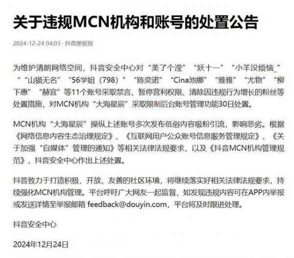 为维护清朗网络空间,抖音安全中心对“美了个滢”“妖十一”“小羊没烦恼_”““山猫无名”“56学姐(798)”“陈奕诺”“Cina池娜”“雅雅”“尤物”“柳下惠”“赫宜”等11个账号采取禁言、暂停营利权限、清除因违规行为增长的粉丝等处置措施,对MCN机构“大海星辰”采取限制后台账号管理功能30日处置。
