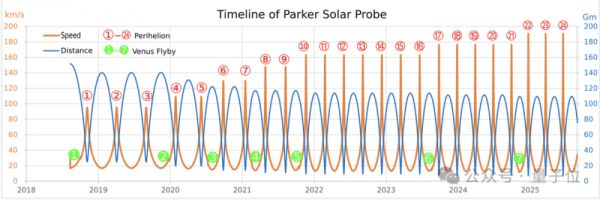 PSP已经完成了七年内七次对金星的飞越,目的是逐渐缩小其绕太阳的椭圆轨道,到任务结束时将一共围绕太阳飞24圈。