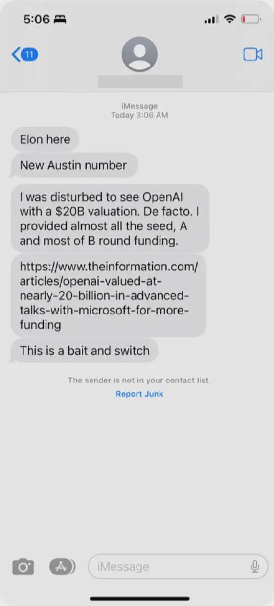 图中是凌晨 3:06 分发来的一连串信息:“我是埃隆”“新的奥斯汀号码”“看到 OpenAI 估值达到 200 亿美元,我很不安。事实上,我提供了几乎所有的种子轮、A 轮和大部分 B 轮资金。”“[新闻报道链接]”“这是诱骗和欺诈”