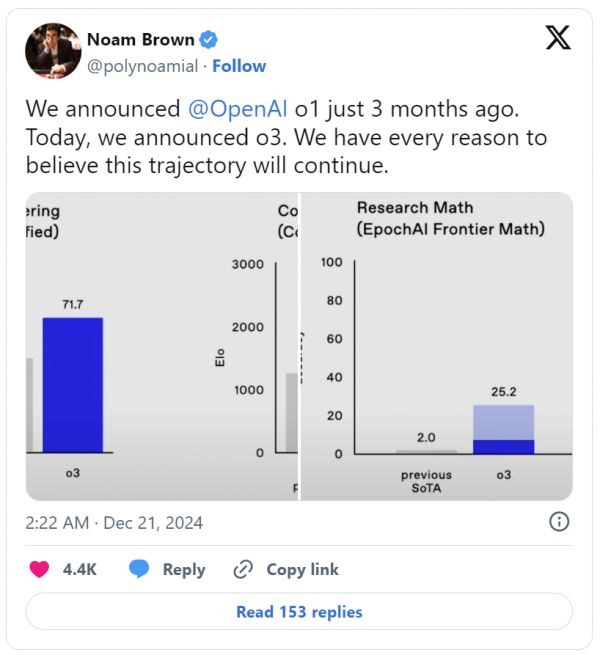 o系列模型的共同创造者Noam Brown在上周五表示,OpenAI在宣布o1模型后的仅仅三个月就发布了o3模型,AI性能的进步速度令人印象深刻: