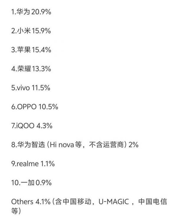 中国五大智能手机品牌市占率超80% 华为占18.1%位居第二苹果跌至第六