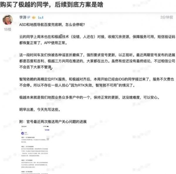 百度IDG运营管理负责人李涛则发布消息称,ASD和地图导航服务将由百度兜底,不会停止服务。百度云和地图团队已与极越技术团队紧密对接,全力保障相关服务。针对用户关注的高精定位RTK服务,李涛表示,团队已全面接管,不会出现“因RTK失效导致智驾功能无法使用”的情况,用户可放心使用。