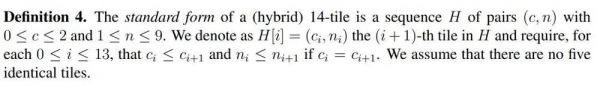 论文的第二部分介绍了很多形式化的麻将规则,包括什么是清一色,怎么样才算完整的牌面(胡牌)等等。例如定义 4 展示了 14 张牌的标准形式,其中作者将条(B)、万(C)、筒(D)表示为 0、1、2,因此 (0, 3) 就表示 B3:三条。