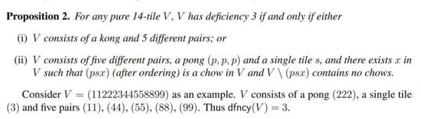如果我们定义了随机 14 张牌的牌面表示和缺牌数,现在只需要知道怎样评估当前牌面的好坏,并通过打牌来把缺牌数降低到 0 就行了。首先对于清一色的 14 张牌,它的缺牌数少于等于 3 张,论文的第三章主要讨论和证明这一点。