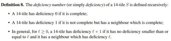 定义牌面的组合后,我们需要一种度量方法以确定当前 14 张牌离胡牌还有多远,这里作者引入了缺牌数(deficiency)。简单而言,缺牌数表示的就是当前牌面到胡牌还差多少张牌。