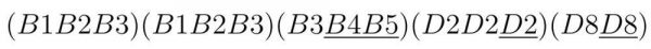 这里我们可以举个例子,如果我们摸上来的 14 张牌为:T = (B1B1B2B2B2B2B3B3)(C1C2C8)(D2D2D8),其中 C2 表示二万。那么现在 p-decompositions 可以表示为: