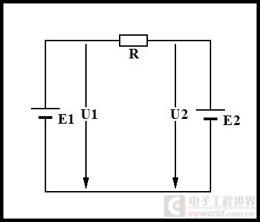 我们测量一下电压U1和电压U2。如果电压U1大于电压U2,就可以判断电阻R左端电位高于右端电位,显然电阻中电流方向是从左向右,如图(02)所示。此时我们就可以判断是电池E1对电池E2充电。当然,如果测量U1和U2结果相反,那就是E2对E1充电。