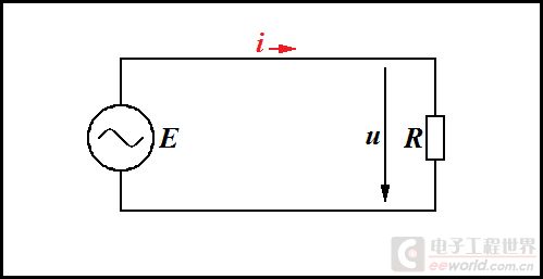 图(03)简单交流电路中,仅有一个交流电源E和一个电阻R作为负载。我们假定电路中电压和电流正方向如图中所示。
