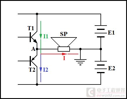 图(10)是个很常见的音频推挽功率放大器。T1和T2是互补的两支三极管,SP是扬声器,E1和E2是直流电源。为简单起见,T1和T2的驱动电路图中未画出。