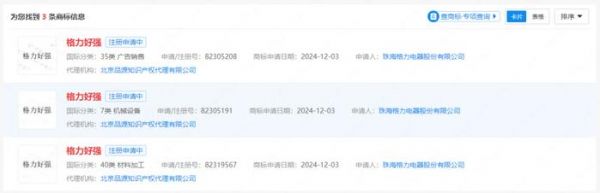 另外,企查查APP显示,近日,珠海格力电器股份有限公司申请注册多枚“格力好强”商标,国际分类涉及广告销售、机械设备等,当前商标状态均为注册申请中。