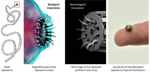 哈佛大学研究者以猪肉绦虫为灵感制造了一款迷你固定装置。它能像真正的寄生虫一样,用钩爪把自己牢牢地钉在人们的肠子上[6]。