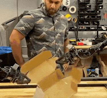 不太能确定它们是否具备了任务泛化能力,但在动作控制上确实做得挺细。两台粗犷、不加修饰的机械臂,能把硬卡纸折成餐盒,把短袖短裤叠得平整,把一打鸡蛋在冰箱里码得整整齐齐。