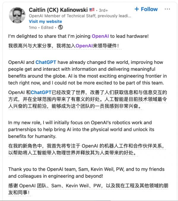 11月,OpenAI把Meta机器人和消费硬件团队的负责人Caitlin Kalinowski挖过来,Caitlin同时也是许多机器人初创公司的顾问。