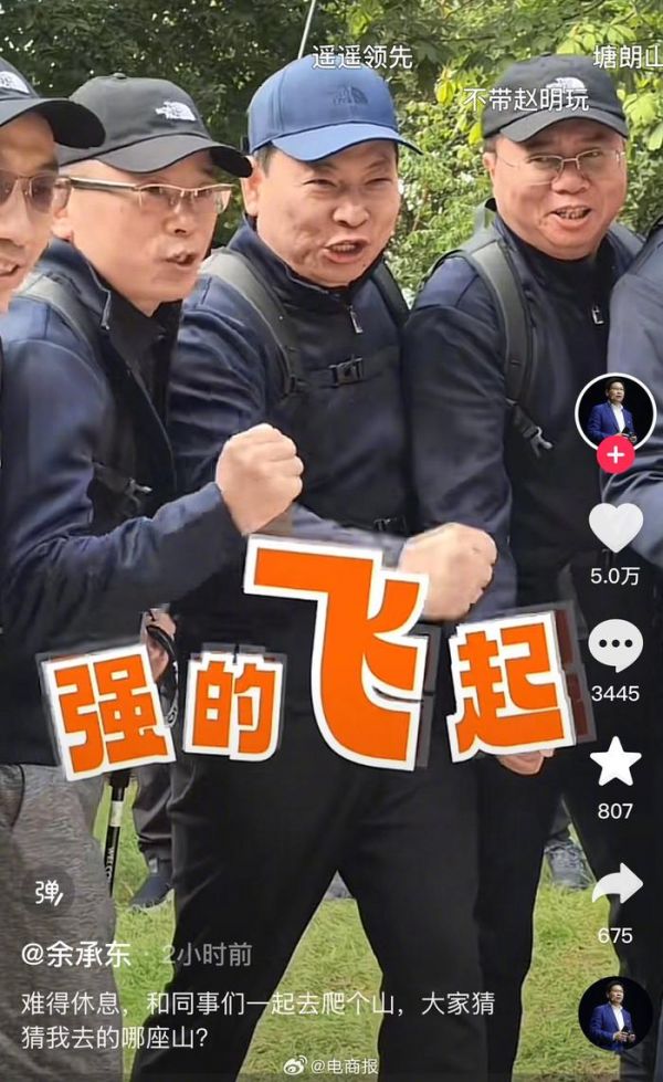 余承东和华为同事组团爬山了,大喊口号“强的飞起”!