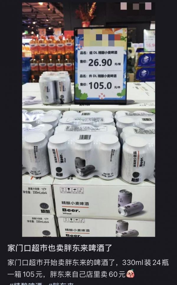 拿胖东来爆款之一的精酿啤酒为例。在胖东来门店,330ml的DL精酿小麦啤酒,6瓶售价15元。在某电商平台的代购店,售价翻一倍变成了32.8元。查看当前商品的买家评价,已经有5000多条。也就是说,只靠这款啤酒,这家店就获利超过7万元。而这样的代购店,在不同电商平台还有很多。