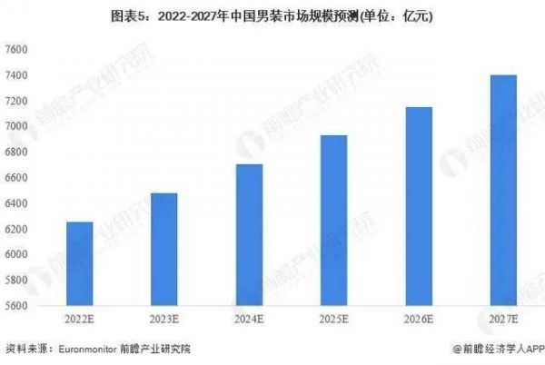 从总量来看,从2014年起,男装市场增速就只能保持在5%左右;2020年受疫情影响更是同比下降12%;如今也一直徘徊在5000亿元左右(欧睿数据)。乐观估计,2027年中国男装市场规模将达7401亿元(Euromonitor),但这其中更多增长空间或许得留给休闲男装。
