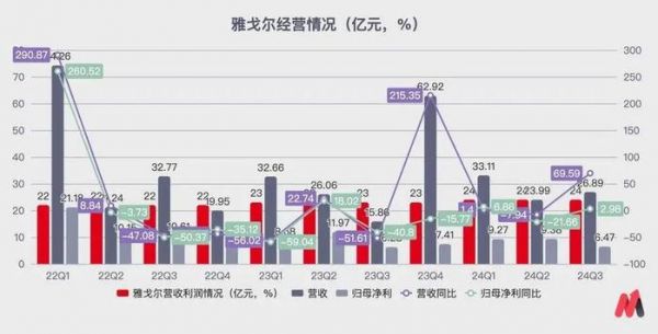 但这一切在2023年开始改变。比音勒芬从2023年Q1到2024年Q3,营收和净利连续增速放缓;2024年Q3营收10.6亿,同比下降4.37%,归母净利为2.8亿,同比大跌17.32%。