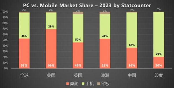 当我们将目光投向海外市场,特别是在欧美澳等发达国家,PC端流量依然占据主导地位。据Statcounter的最新统计数据,2023年,美国PC端的市场份额高达69%,而在澳大利亚,这一比例也超过了半数,达到了52%。这也意味着有出海业务的广告主,就必须得重视PC端的广告投入。