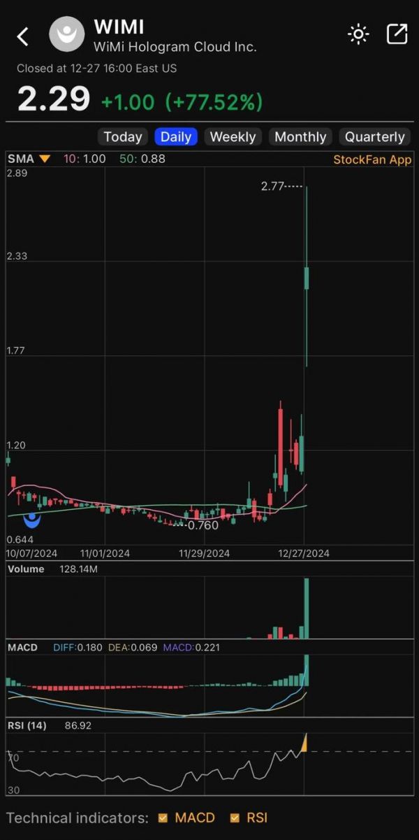12月28日周五,中概股微美全息(WIMI.US)大幅收涨77.5%。股价飙涨之前,开发全息增强现实(AR)技术的微美全息在过去10天连续发布5篇关于进入量子计算领域的新闻稿,导致其股价过去10天涨超200%。“炒概念”已经成为美股“赚快钱”的新趋势。