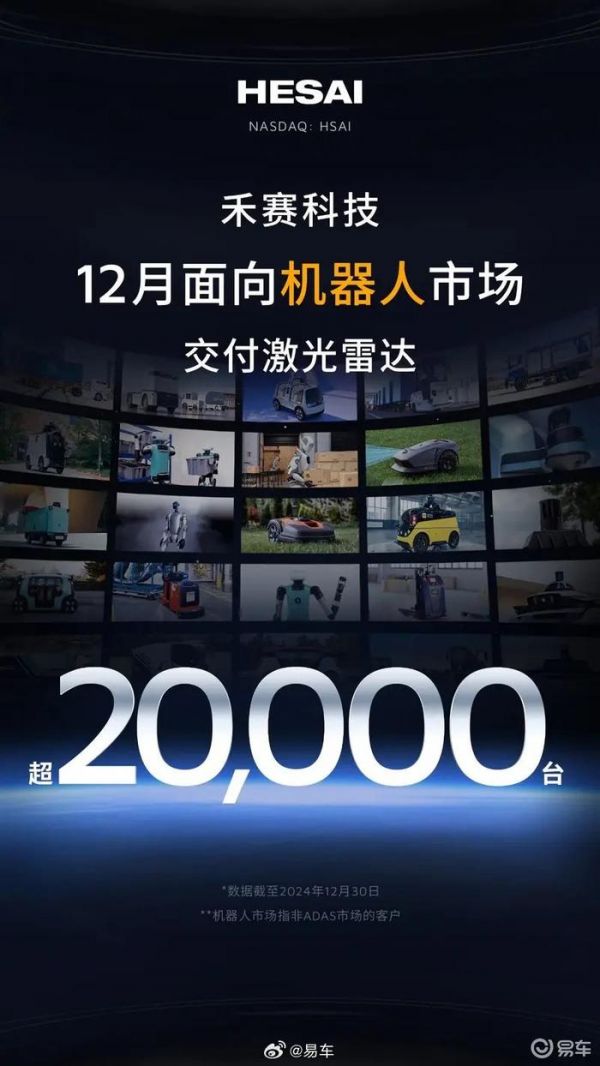 #汽车情报局#【禾赛月交付突破10万大关 机器人领域月交付超过2万】12月30日,禾赛科技官方宣布12月激光雷达交付量突破100,000台,成为全球首个达成单月交付量超过10万台的激光雷达企业。值得一提的是,禾赛面向机器人市场单月交付激光雷达超过20,000台,广泛覆盖移动机器人、配送机器人、清扫机器人、割草机器人等多个领域。