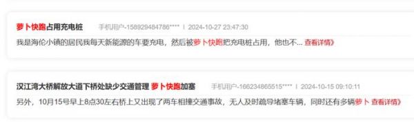 再者,现阶段的Robotaxi技术还远未达到令人完全放心的程度。在武汉城市留言板上,小雷看到不少关于萝卜快跑在绿灯状态下停滞不前、堵在路口附近、转弯时卡顿不动、加塞、占用充电桩等情况。
