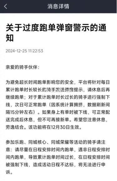 12月30日,美团正式在全国主要城市上线骑手“防疲劳”机制,旨在保障骑手的健康与安全。据悉,该机制规定骑手跑单超过8小时将收到系统提醒,此后每隔一小时再次提醒;若连续跑单达到12小时,系统将强制骑手下线休息。