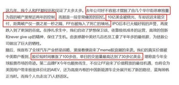 开文,贾跃亭以“2024奋斗者”自称,聊到了2024年自己所作的一些事情,主动提到了10亿美金被烧光,车却迟迟未能交付的事情,宣称距离破产仅一票之差一秒之隔,FF被拖入了死亡的境地。