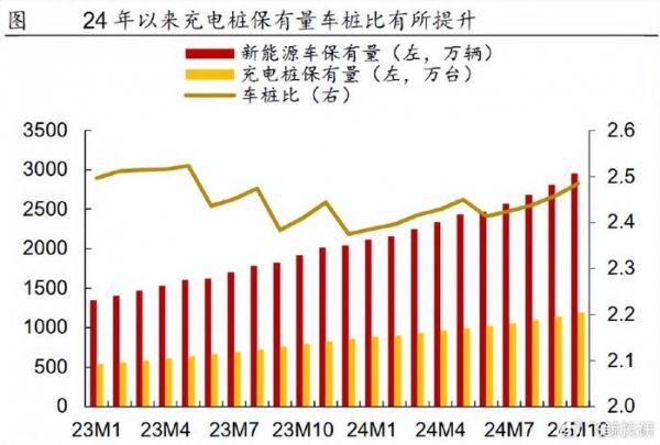 不仅如此,由于充电桩建设增速小于新能源汽车销量增速,车桩比正迅速增加。截至2024年10月,国内新能源汽车车桩比达2.5,说明充电桩的缺口依旧不小。