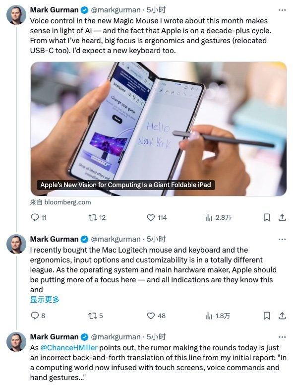 彭博社记者马克·古尔曼(Mark Gurman)在 X 上发布推文,表示虽然目前没有听到相关的曝料线索,但他认为苹果为妙控鼠标加入 AI 语音控制功能“合情合理”。