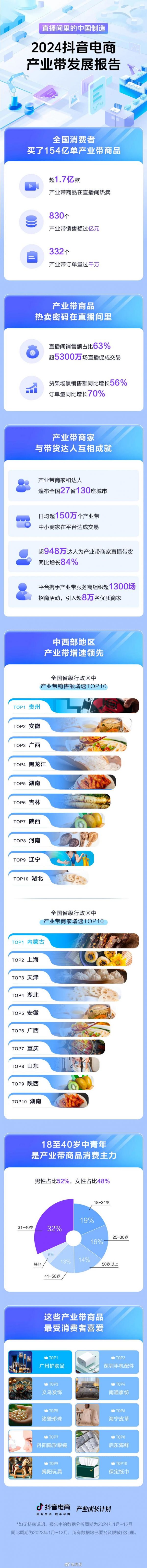 抖音电商全年销售154亿单产业带商品,830个产业带销售额过亿