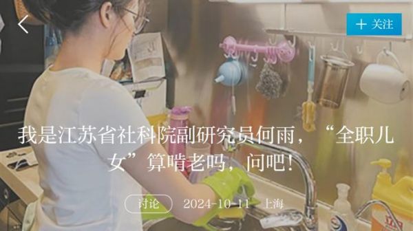 何雨 江苏省社科院副研究员:这个发现还是蛮有代表性的。从实际调研中看,全职女儿确实要比全职儿子多得多。原因可能有:一是女性更愿意表达,所以能够把全职的状态公开;二是在社会的角色期待中,男性必须要承担更大的养家责任,同时,其能够接受的工作类型谱系更为广泛,如,实在不行就到工地打工,这使得男性就业规模总体要大于女性;三是客观存在的社会性别歧视,也让更多的就业岗位或机会向男性倾斜。