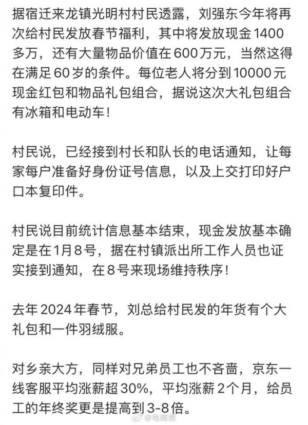 刘强东再给老家发钱,村民:60岁的一人一万现金,1400多户发了几千块礼品。去年,刘强东还送了9吨年货。
