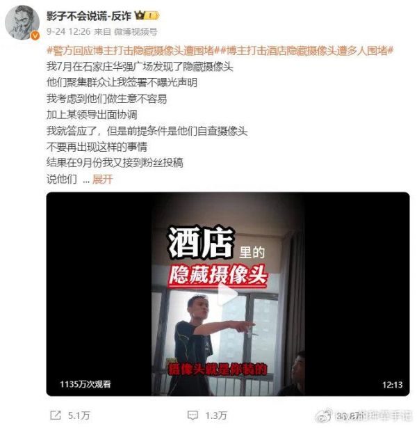 博主@影子不会说谎-反诈发视频曝光,在石家庄某酒店民宿发现了隐藏摄像头,在进行摄像头确认和拆除后,却遭到酒店民宿老板围堵。
