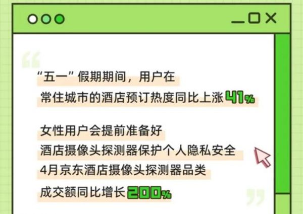 据同程和京东发布的《五一出游风向标》显示,女性是购买摄像头探测器的主力军,在假期出行前,摄像头探测器的成交额同比增长200%。