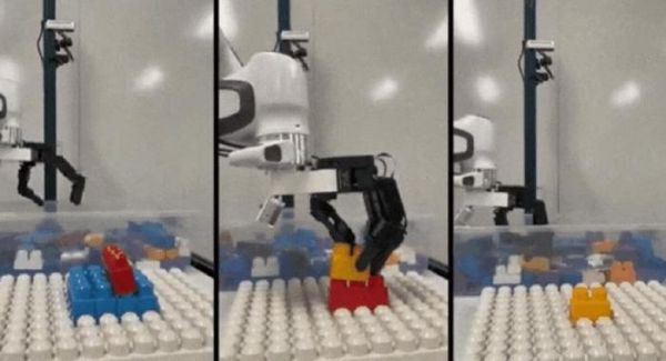 ▲机器人正在完成翻找、抓取、重定向、插入的积木搭建流程