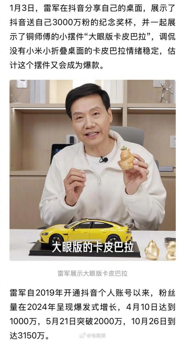 雷军抖音粉丝超董宇辉,达2688.5万
