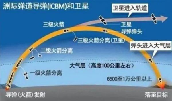 如果我们期望一枚弹头能够飞得非常远,比如几千千米,甚至上万千米,那么大炮也不够用了,所能采用的只有运载火箭(或称助推火箭)。而且随着弹头飞行距离的增加,火箭的级数也相应增加,这一点与我们常见的卫星发射十分相似,只不过卫星的目的地是在太空中,而弹头的目标地点则是地球上的另一个地方。