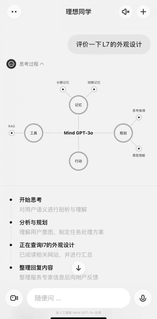 但将理想同学推向手机、进入更多场景,也意味着加入一个更激烈的战场,需要更强的实力。理想选择在基座模型上下功夫。理想新一版端到端多模态模型Mind GPT3o已正式上线为理想同学提供支持,其响应速度达到百毫秒级,能够理解不同模态,记忆、规划、工具、表达能力均得到提升。