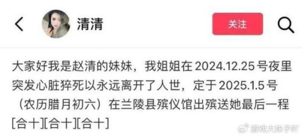 她就是41岁美女网红清清,大名叫赵清,她在短视频平台里拥有一定的粉丝量,而最近她妹妹突然发布内容,宣布姐姐突然离世,是心脏猝死。