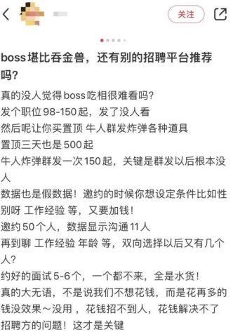 据用户统计,如果开通BOSS直聘所有权益,企业每月花费将在3000元以上,年费高达数万元。有企业用户就反馈,这几年该公司在BOSS直聘的年费基本都是5万元一年,能抵上前程无忧、猎聘、智联招聘三家的费用。“真是不敢想象。”