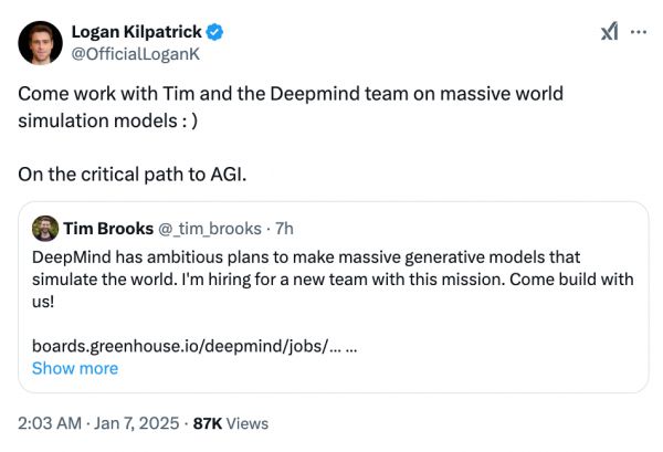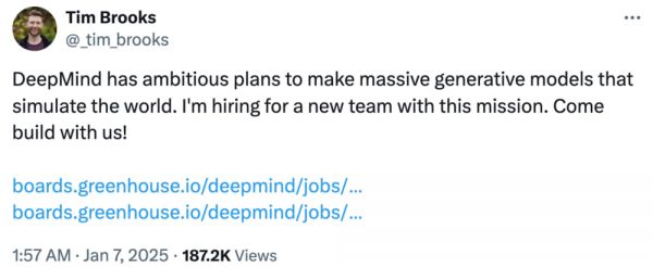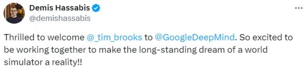 本周一,Tim Brooks 在 X 上宣布:“DeepMind 有雄心勃勃的计划,要打造能够模拟世界的大规模生成模型。我正在为这个使命组建一个新团队。”