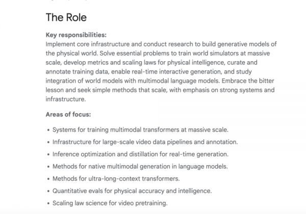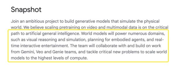 根据这个帖子中所附链接的招聘信息,这个新团队将与谷歌的 Gemini、Veo 和 Genie 团队合作,并在他们的工作基础上,解决“关键性的新问题”,并将模型扩展到“最高计算水平”。