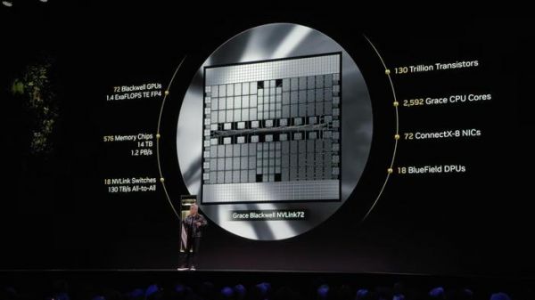 黄仁勋:我们的目标是创建一个巨型芯片,该芯片将使用72个Blackwell GPU或144个芯片,超越世界上最快的超级计算机的能力。