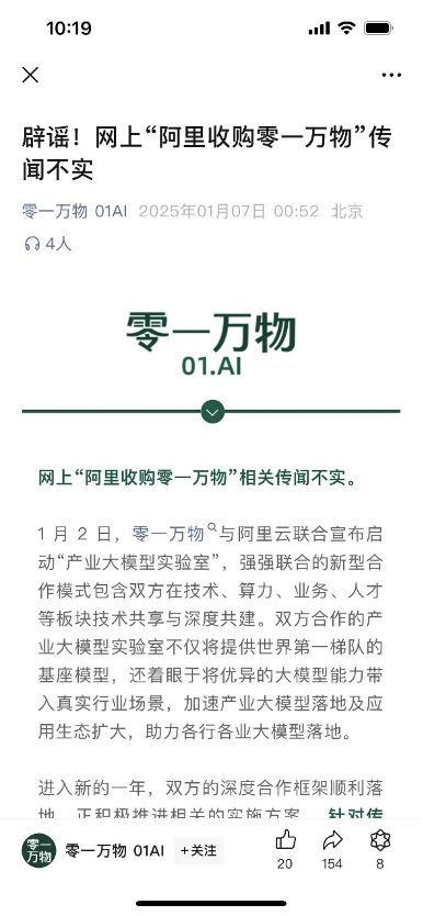 1月6日据第一财经报道,阿里云正在洽谈收购零一万物的预训练团队,引发业内讨论。但是该消息很快被零一万物官方辟谣。