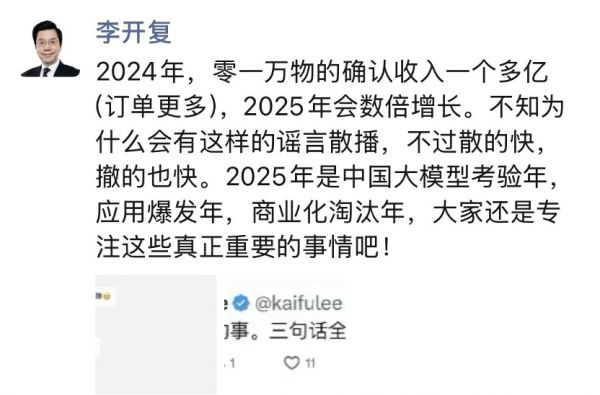 零一万物澄清阿里收购传闻,2024年收入超亿元