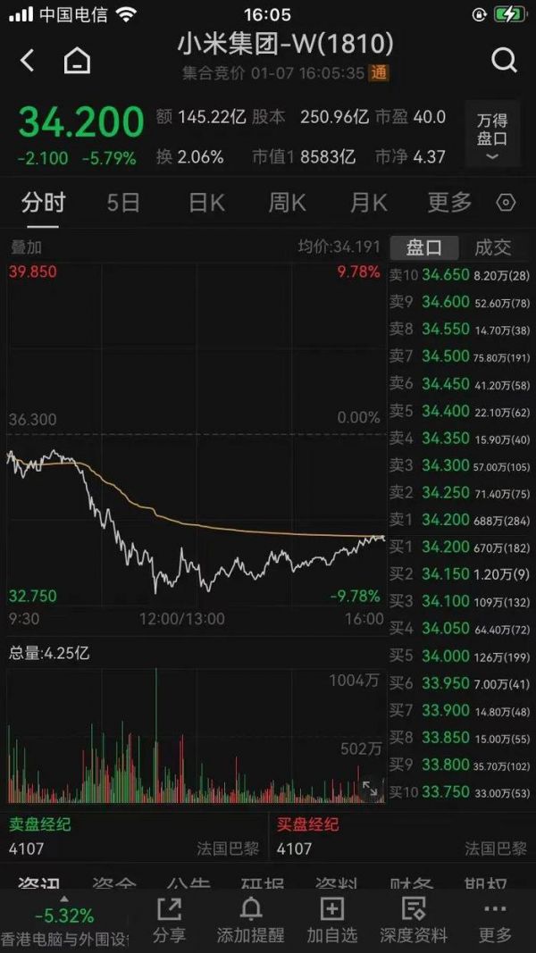 自去年3月28日小米SU7正式发布后,小米集团股价一路上扬,近日更是连创历史新高,不过1月7日,小米集团股价大跌5.79%,每股报34.2港元,总市值为8583亿港元。