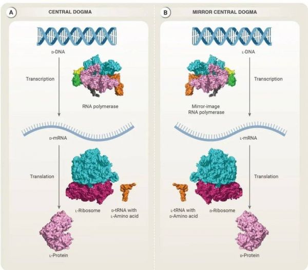 既然地球上现有生物体对于构成生命的重要大分子如蛋白质、糖类,都有着单一选择偏好,那么理论上讲,是否存在一个平行世界,那里的所有生命是和地球生命“互为镜像”的呢?又是否存在一种可能,我们可以人为创造一个由左旋DNA、右旋氨基酸、左旋蛋白质和左旋糖构成的生物呢?