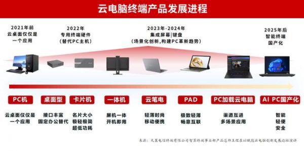 2021年前,云电脑在终端侧仅仅是一个应用,那时还叫做 “云桌面”。2022年出现了专有的云电脑终端硬件替代PC主机。2023年到2024年,硬件集成屏幕和键盘,云电脑终端形态进一步多样化,满足不同场景下用户多样化需求,并开始成为PC发展新趋势。展望2025年,天翼电信终端有限公司智算终端事业部产品总师王煜表示,通用PC加载云电脑的能力实现端云融合,AI PC实现多智能体交互的体验,终端硬件的国产化率也在不断地提升。中兴通讯副总裁华新海认为,云电脑天然具备弹性的硬件能力,为此,AI就是云电脑天生的优势。