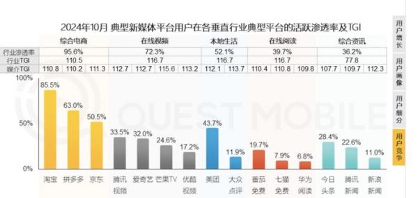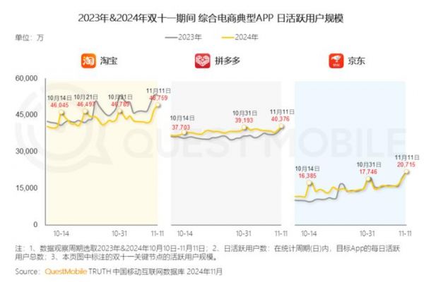 电商平台用户也逐渐进入饱和期。根据QuestMobile数据显示,综合电商行业在2024年10月活跃渗透率为95.6%,电商平台的用户几乎见顶了。从2024年双11期间的日活峰值数据来看,淘宝出现同比下滑,京东与拼多多则持平。