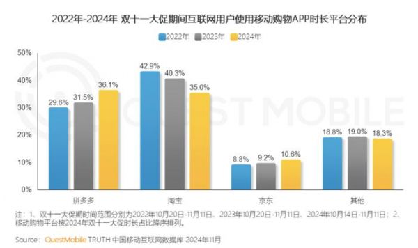 高速增长的拼多多,不断蚕食其他平台份额,羡煞了旁人。根据QuestMobile发布的2024年“双十一”洞察报告,拼多多在过去三年中用户使用时长占比迅猛增长,至2024年超过淘宝达到36.1%。